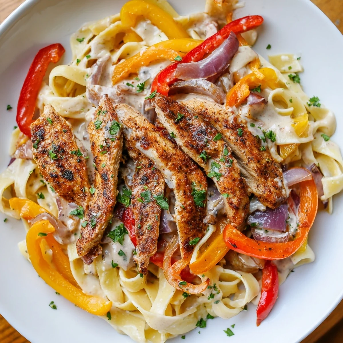 This dish features tender chicken breasts seasoned with bold Cajun spices, seared to a golden brown. Sautéed bell peppers and red onion add vibrant flavors and textures, paired with a garlic-infused creamy sauce made from butter, heavy cream, and Parmesan cheese. The sauce is gently simmered and combined with perfectly cooked fettuccine, creating a rich and satisfying meal finished with fresh parsley and extra Parmesan for garnish.