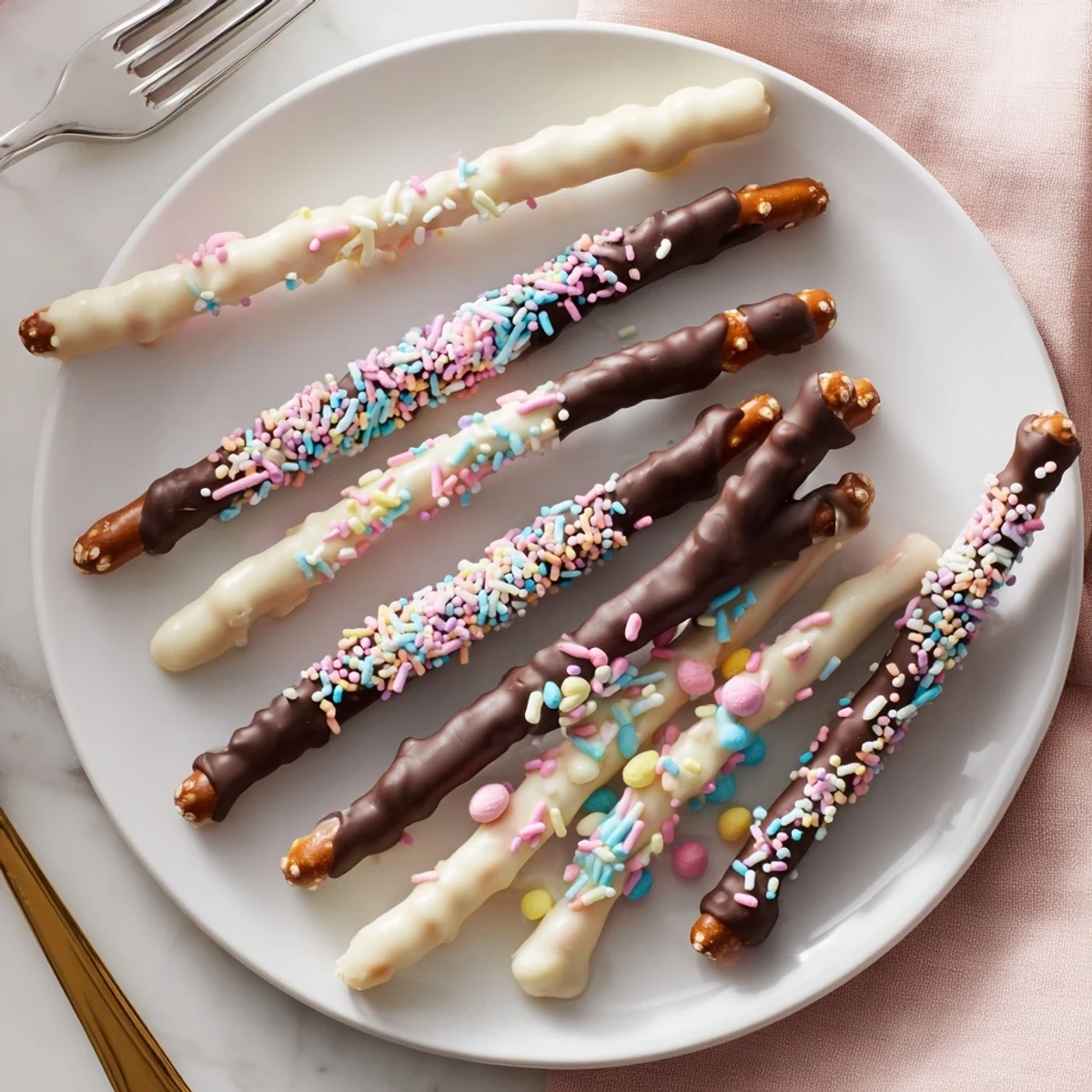 Absolutely! Regular twist or mini pretzels work wonderfully for bite-sized treats. Simply dip them halfway into melted chocolate using tongs or a fork, then tap gently to remove excess before decorating with sprinkles.