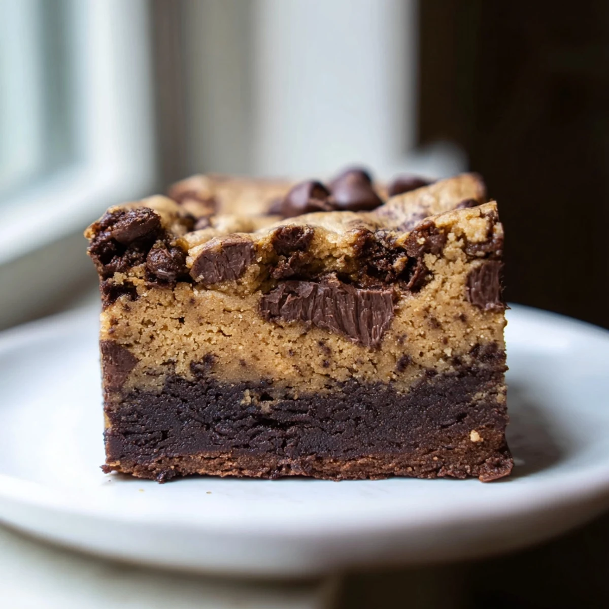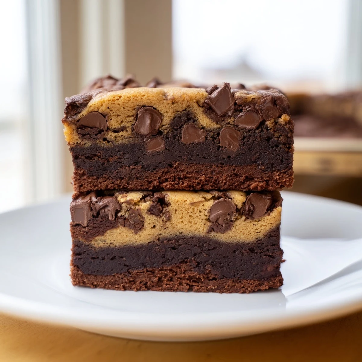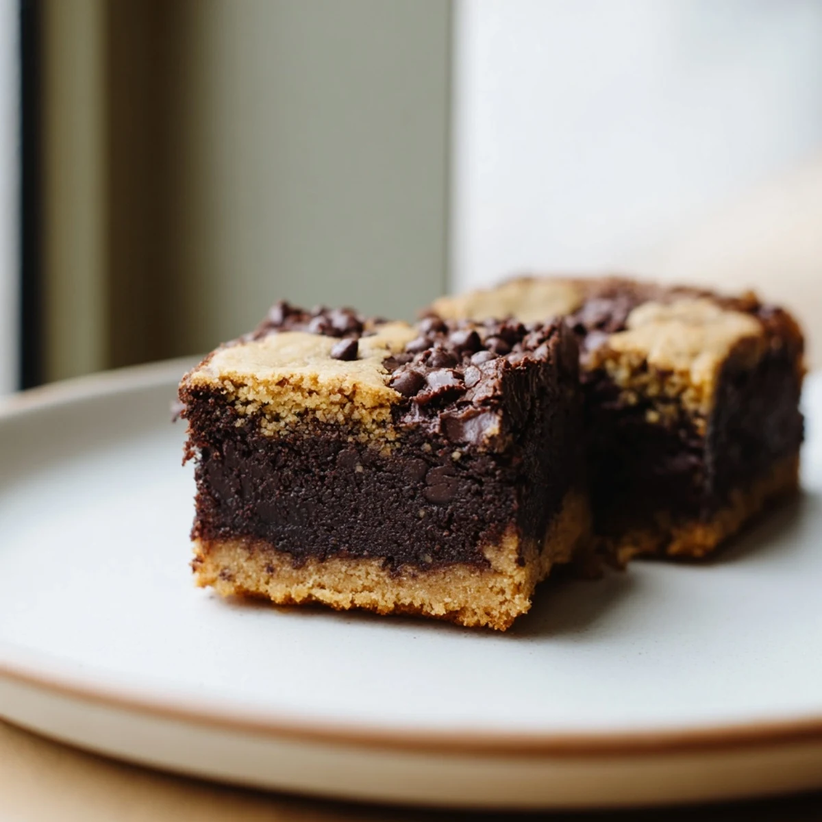 Experience the ultimate dessert mashup with these double-layer vegan bars. The bottom layer features rich, fudgy cocoa brownie with melted coconut oil and dark chocolate chips. On top, a chewy chocolate chip cookie dough made with creamed vegan butter and brown sugar creates the perfect contrast. Baked together until golden, these bars deliver the best of both worlds in every bite. Perfect for gatherings or when you can't decide between brownies or cookies.