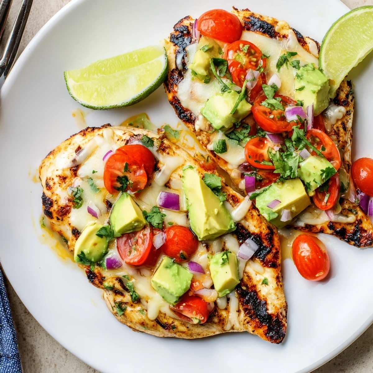 Bright, lime-forward chicken is whisked with olive oil, garlic, honey and Tex‑Mex spices, then marinated briefly and grilled until juicy. Top with diced avocado, cherry tomatoes, red onion and cilantro; finish with a squeeze of lime and optional melted Monterey Jack. Rest the breasts before slicing, and add jalapeño or crushed red pepper for heat. Ready in about 40 minutes for four.