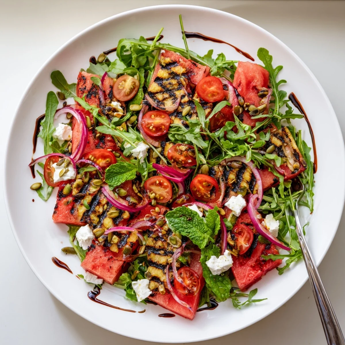This vibrant summer dish transforms juicy watermelon through the magic of grilling, creating irresistible smoky char marks that contrast beautifully with the fruit's natural sweetness. The warm, caramelized cubes pair perfectly with crisp arugula, sweet cherry tomatoes, and sharp red onion.