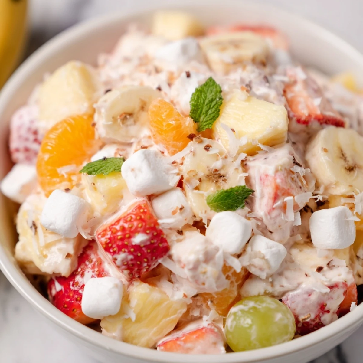 Best enjoyed within 24 hours for optimal texture and freshness. After that, the fruits may release excess liquid and the mixture can become watery. The marshmallows will also soften significantly over time.