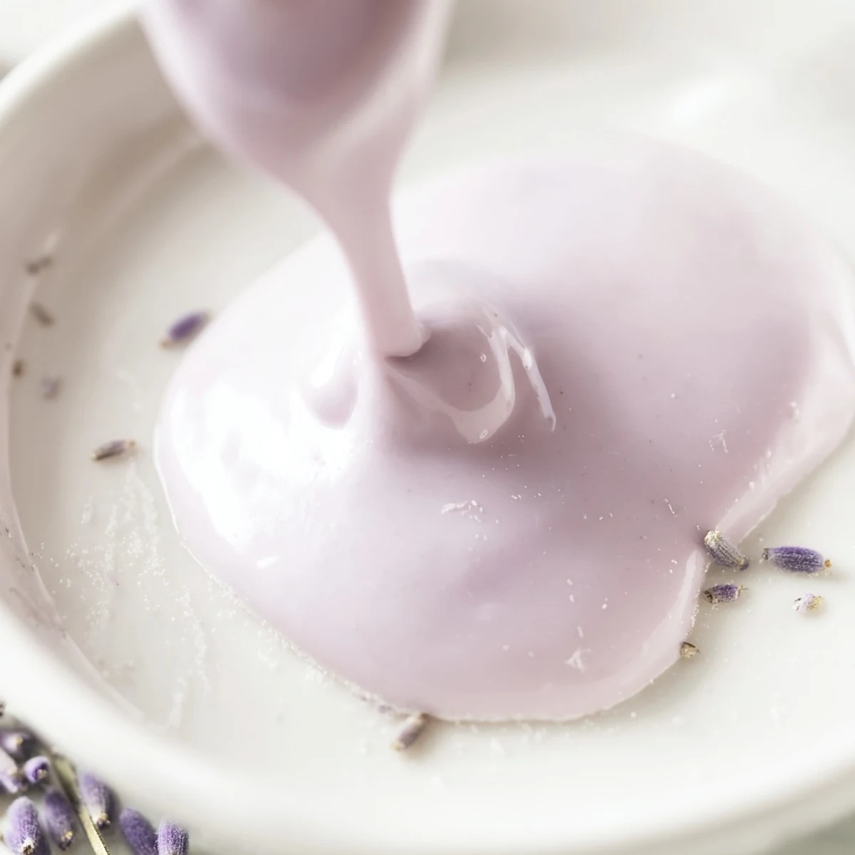 The preparation involves steeping dried culinary lavender in warm milk, then combining with powdered sugar for a smooth, pourable consistency. Adjust thickness easily by varying the milk amount. The optional lemon juice brightens the floral notes and adds subtle complexity.