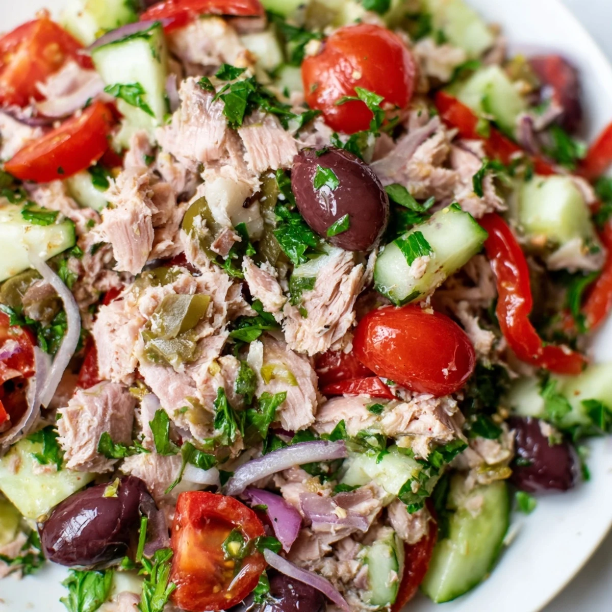 This Mediterranean-inspired tuna salad combines protein-rich tuna with crisp cherry tomatoes, cucumber, red onion, and roasted red peppers. Kalamata olives and capers add briny depth, while a bright lemon-olive oil dressing with garlic and oregano ties everything together. Ready in just 15 minutes with no cooking required, it's an ideal choice for warm weather meals or quick weekday lunches.
