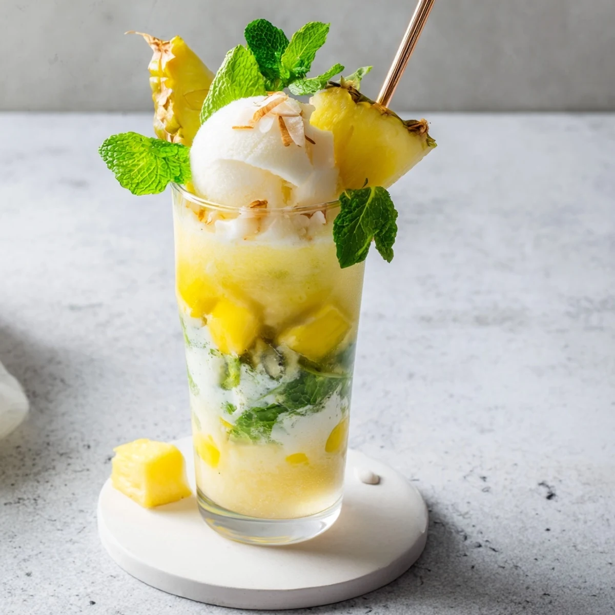 - Add fresh mint leaves, a wedge of pineapple and a sprinkle of toasted coconut flakes on top. Serve immediately with both a straw and a long spoon.